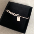 Deze zilveren armband is gemaakt van 2 soorten schakels met een zilveren plaatje ertussen.