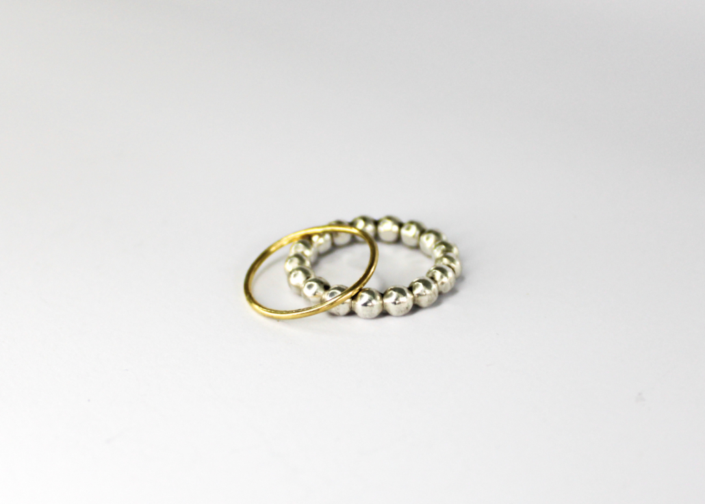 De ring is opgebouwd uit zilveren bolletjes van 4 mm doorsnede.